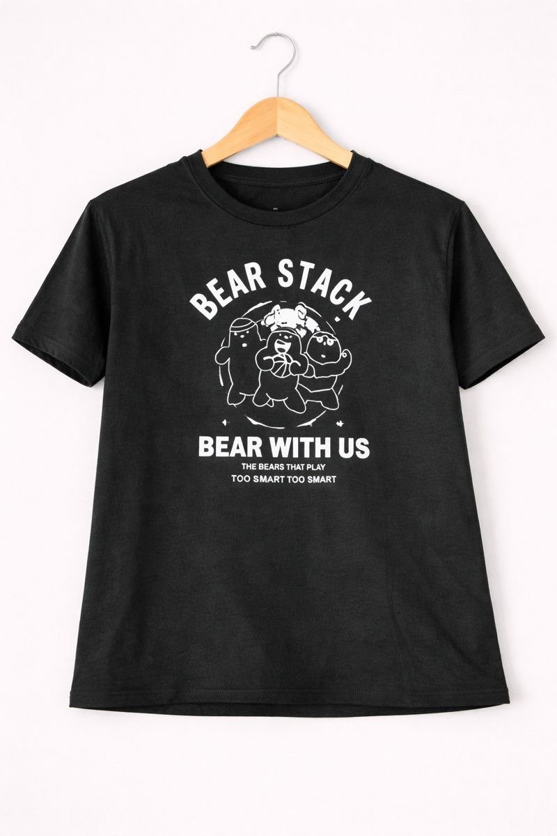 Add a fun and quirky touch to your casual wardrobe with the Bear Stack Graphic Tee. Designed in classic black, this t-shirt features a playful bear illustration with the text “Bear Stack – Bear With Us”, giving it a cool and light-hearted vibe. Made from soft, breathable fabric, it offers a comfortable fit for everyday wear. Perfect for casual outings, college wear, or relaxed weekends, this tee pairs effortlessly with jeans, joggers, or shorts for an easy street-style look.