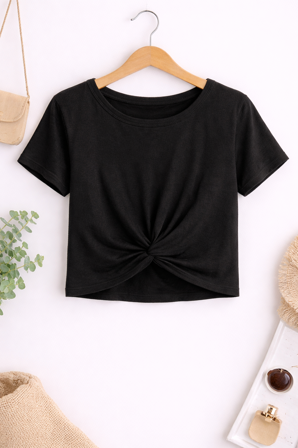 Elevate your everyday style with this Black Front Twist Crop Top. Designed with a modern twist detail at the front, this top creates a flattering, cinched look that enhances your silhouette. Made from soft, stretchable fabric, it offers all-day comfort while maintaining a trendy appearance. The classic round neckline and short sleeves make it easy to pair with jeans, skirts, or high-waisted trousers. Perfect for casual outings, college wear, or relaxed evening looks.