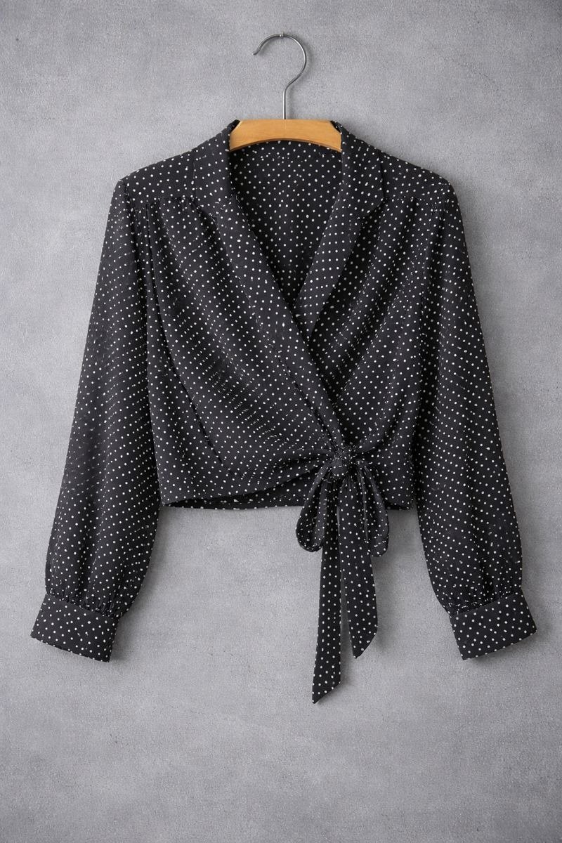 Add a touch of elegance to your wardrobe with this Black Polka Dot Wrap Top. Designed with a flattering wrap-around silhouette and adjustable tie-up detail, it offers a comfortable yet stylish fit. The lightweight fabric drapes beautifully, making it perfect for both casual outings and dressed-up looks. Pair it with skirts, jeans, or trousers for an effortless chic style.