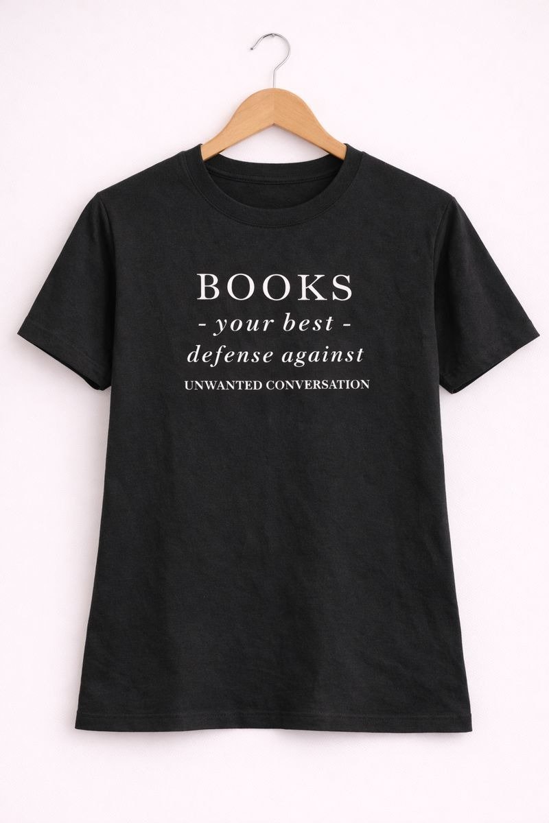 Make a bold and relatable statement with the Books – Your Best Defense Black Printed T-Shirt. Featuring a witty quote for book lovers and introverts, this t-shirt perfectly reflects a love for reading and quiet moments. Crafted from soft, breathable fabric, it offers comfortable all-day wear with a relaxed fit. Ideal for casual outings, college wear, or cozy reading days, this tee pairs effortlessly with jeans, trousers, or joggers for a smart yet laid-back look.