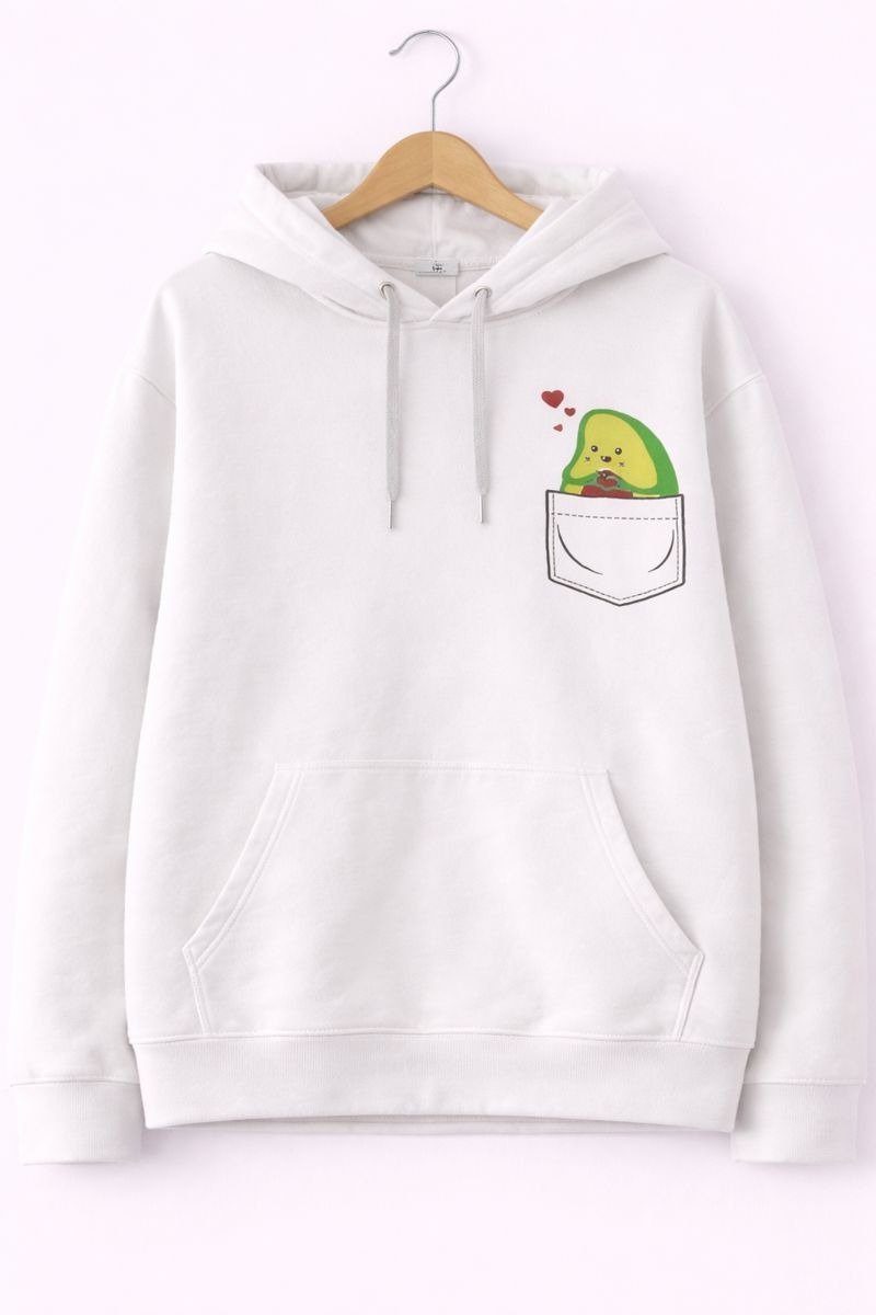 Add a fun and playful touch to your winter wardrobe with our Pocket Avocado White Hoodie. Made from soft, cozy fabric, this hoodie features a cute avocado graphic peeking out from a pocket design with tiny heart details. Designed with a comfortable hood, full sleeves, and a relaxed fit, it’s perfect for casual outings, college wear, or everyday comfort. Pair it easily with jeans or joggers for a cute and trendy look.