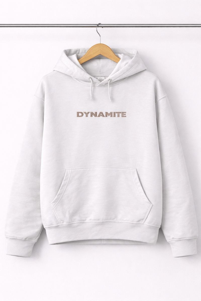 Make a bold yet minimal style statement with this Dynamite White Hoodie. Crafted from soft and comfortable fabric, this hoodie features a clean “DYNAMITE” text print on the front for a modern and confident look. Designed with a cozy hood, ribbed cuffs and hem, and a front kangaroo pocket, it offers everyday comfort with effortless style. Perfect for casual outings, college wear, or relaxed weekends, this hoodie pairs easily with jeans, joggers, or sneakers.