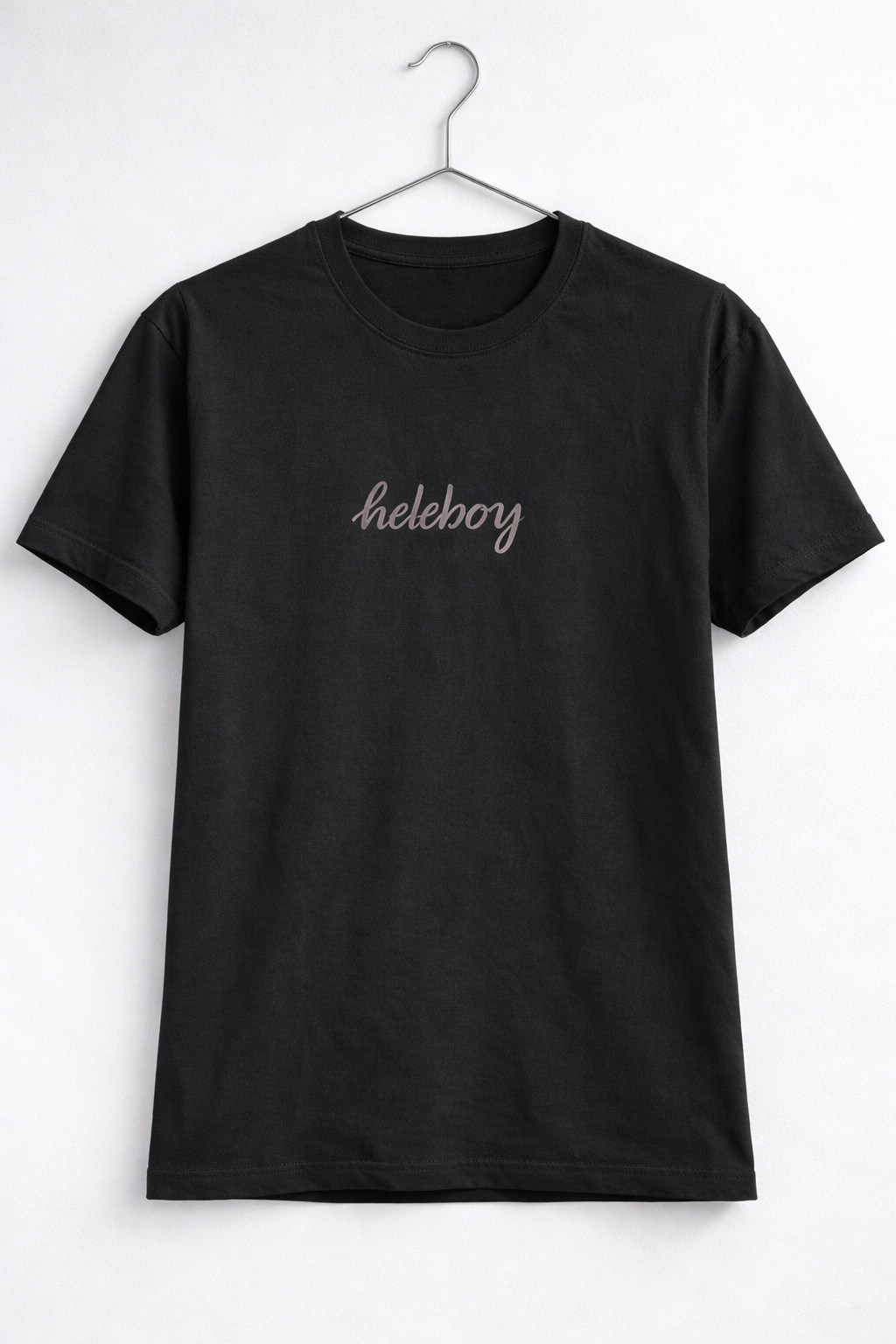 This black T-shirt features a clean and stylish “Heleboy” cursive text printed on the chest, giving it a modern and minimal look. Made from soft, breathable cotton fabric, it offers excellent comfort for everyday wear. The classic round neck and regular fit make it suitable for casual outings, daily use, or street-style fashion. Easy to match with jeans, trousers, or shorts, this T-shirt is perfect for those who prefer simple yet trendy designs.
