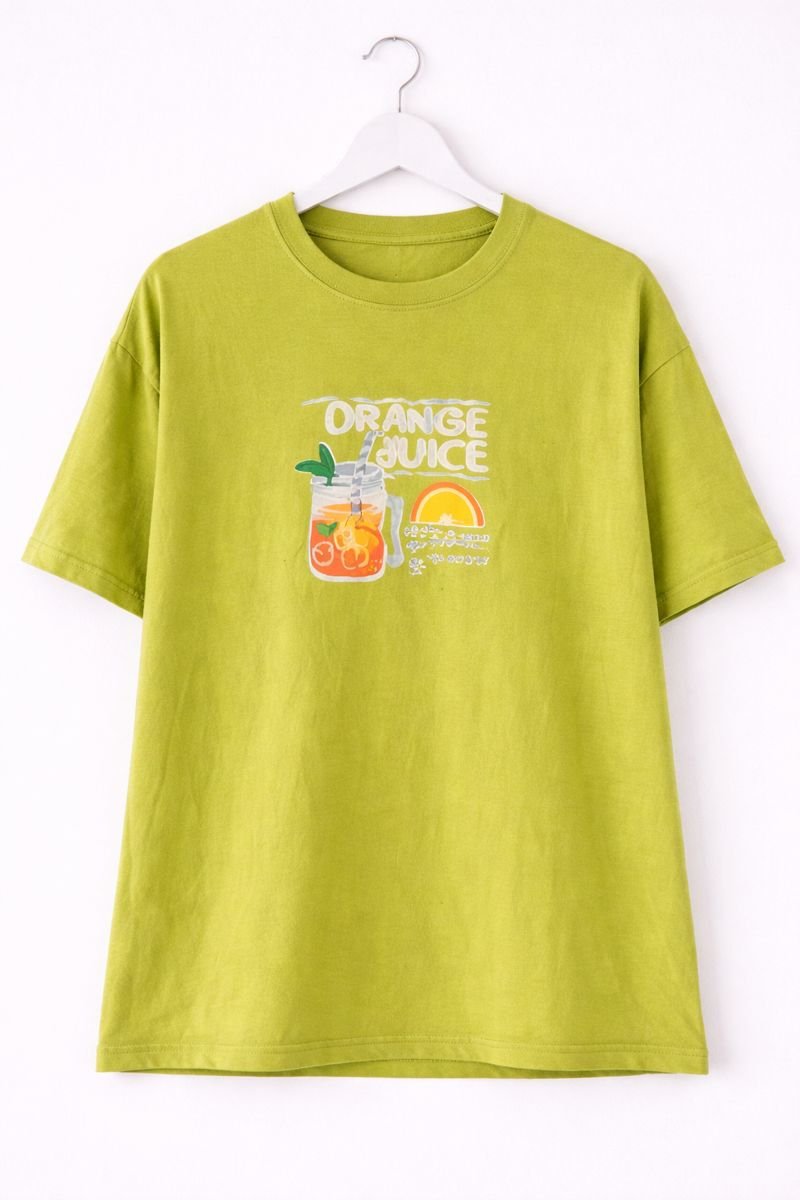 Add a fresh and playful touch to your everyday look with this Orange Juice Graphic Oversized Tee. Designed in a soft green shade, this T-shirt features a cute juice graphic that gives a fun, summer-ready vibe. Made from breathable cotton fabric, it offers a relaxed oversized fit for all-day comfort. Perfect for casual outings, lounging, or pairing with jeans and shorts for an effortless style.