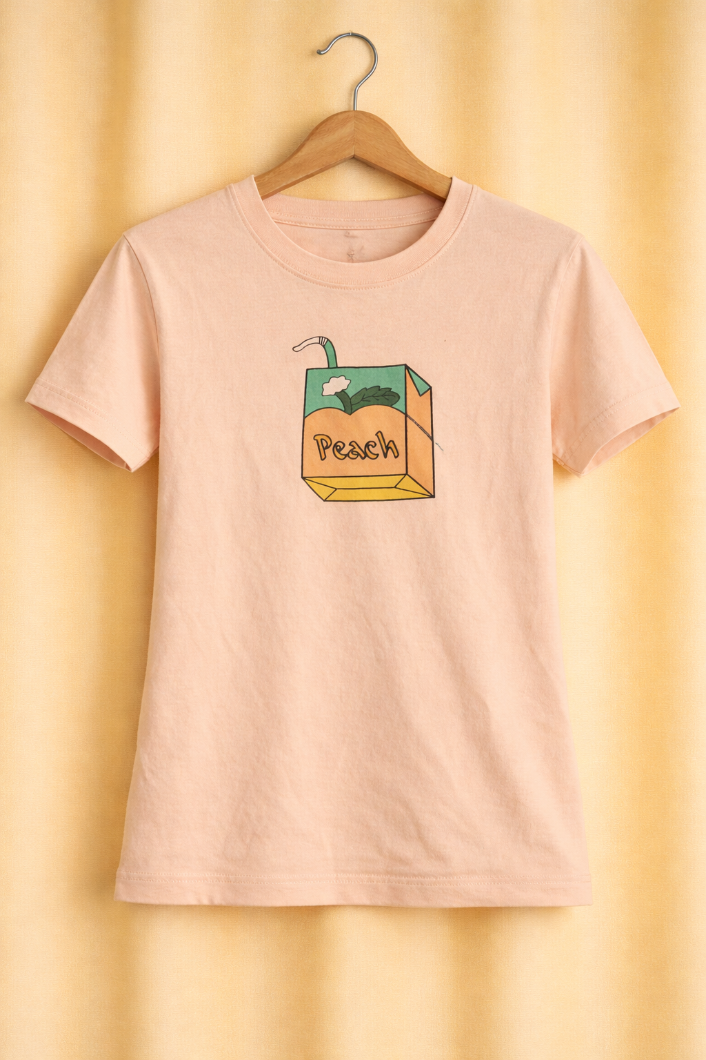 This peach color graphic T-shirt is made from soft and breathable cotton fabric for everyday comfort. Featuring a cute peach juice box print on the front, it adds a fun and playful touch to your casual look. Designed with a classic round neck and half sleeves, this T-shirt is perfect for daily wear, casual outings, or relaxed weekend styling.