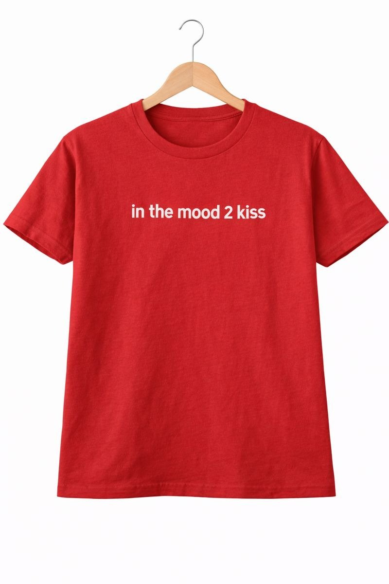 Add a playful and flirty touch to your casual style with this Red In The Mood 2 Kiss T-Shirt. Featuring a bold and fun text print on a vibrant red base, this t-shirt is perfect for making a confident statement. Crafted from soft and breathable fabric, it offers comfortable all-day wear. Ideal for casual outings, date nights, or relaxed hangouts, this tee pairs effortlessly with jeans, shorts, or joggers.