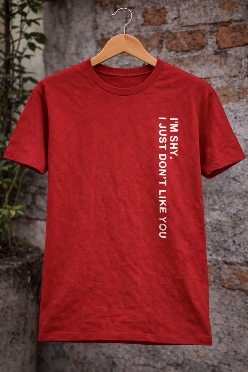 Make a bold statement with this red T-shirt featuring the edgy quote “I’m shy, I just don’t like you” printed in a clean vertical design. Made from soft and breathable cotton fabric, this T-shirt offers a comfortable fit for everyday wear. The confident, attitude-filled text adds a modern street-style vibe, making it perfect for casual outings, college wear, or daily styling. Pair it with jeans or cargos for an effortless, standout look.