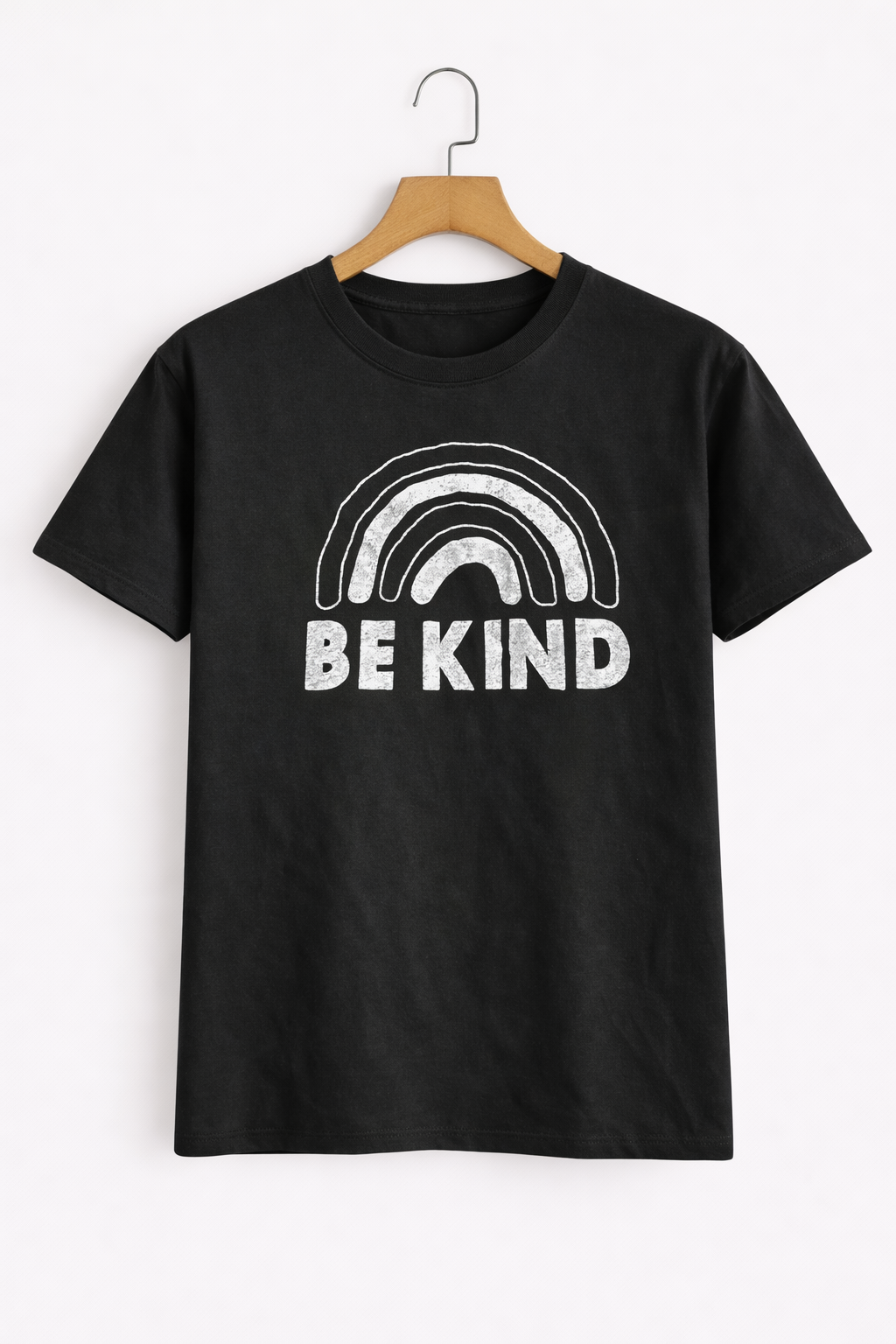 Spread positivity in style with this unisex black half sleeve T-shirt featuring a trendy “Be Kind” slogan with a minimal rainbow graphic. Made from soft and breathable fabric, this T-shirt ensures all-day comfort and a relaxed regular fit. The classic round neck and bold white print create a clean yet meaningful look. Perfect for casual outings, daily wear, or laid-back weekends, this T-shirt pairs easily with jeans, joggers, or shorts for a modern and comfortable style.
