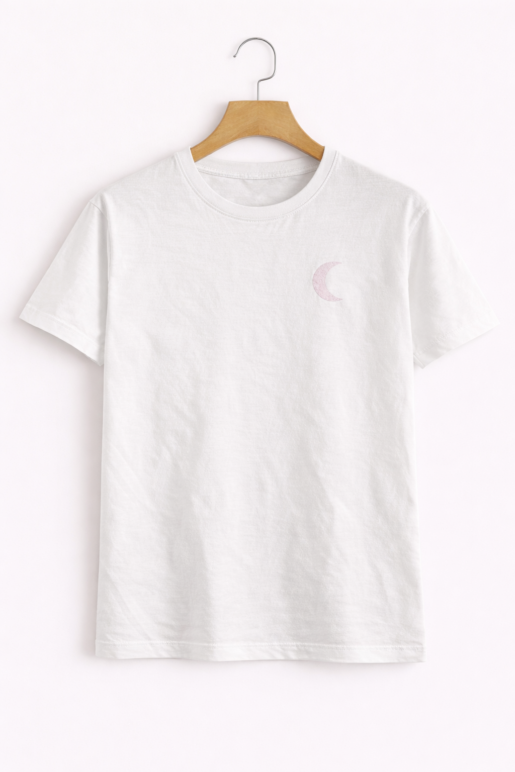 Embrace a clean and minimalist style with this unisex white half sleeve T-shirt featuring a subtle crescent moon print on the chest. Made from soft, breathable fabric, this T-shirt offers a comfortable feel and a regular fit for everyday wear. The classic round neck and delicate graphic design make it perfect for casual outings, daily use, or relaxed weekend looks. Easy to pair with jeans, shorts, or trousers, this T-shirt is ideal for those who love simple yet aesthetic fashion.