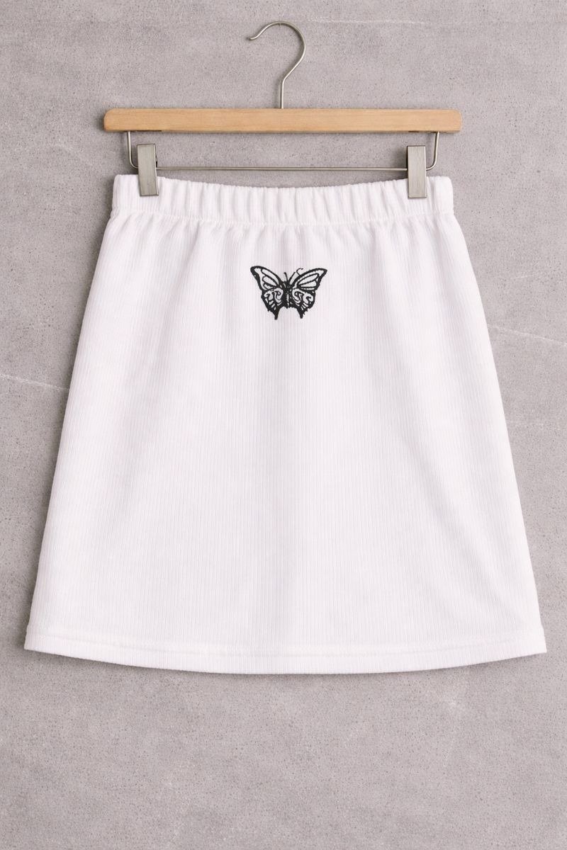 This white ribbed skirt features a delicate butterfly embroidery that adds a subtle yet stylish touch to a clean, minimal design. Made from soft and stretchable ribbed fabric, it offers a comfortable fit with easy movement for all-day wear. The elastic waistband provides a flexible and snug feel, making it perfect for casual outings, daily wear, or relaxed styling. Easy to pair with crop tops, tees, or shirts, this skirt is a versatile addition to any wardrobe.