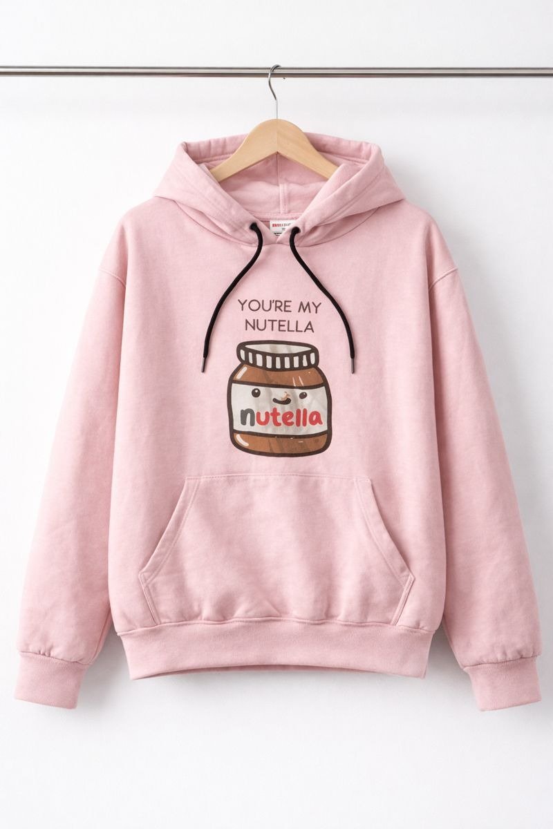 Bring a cute and cozy vibe to your winter wardrobe with this You’re My Nutella Pink Hoodie. Crafted from soft, warm fabric, this hoodie features a playful Nutella jar graphic with a charming quote that adds a fun and lovable touch. Designed with a comfortable hood, contrast drawstrings, ribbed cuffs, and a front kangaroo pocket, it’s perfect for casual outings, lounging, or everyday wear. Easy to style with jeans or joggers for a relaxed and trendy look.